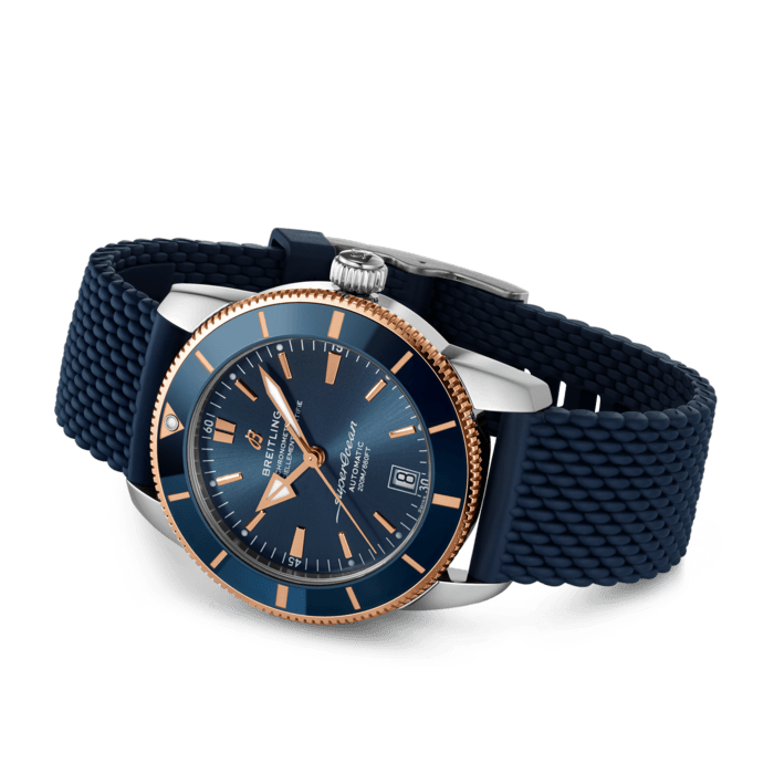 Inspired by the original Superocean from the 1950s, the Superocean Heritage combines iconic design features with a modern touch. Sporty and elegant, the Superocean Heritage is a true embodiment of style at sea. Featuring the iconic triangular-shaped hands as well as a unidirectional bezel with a polished ceramic ring, the Superocean Heritage is an elegant looking diver’s watch. Available in a variety of sizes and materials including stainless steel and 18k red gold, the Superocean Heritage B20 Automatic features a range of black, blue or green dials. Offered either with a matching mesh bracelet, or a “mesh-styled” rubber strap fitting a folding buckle, this Superocean Heritage is powered by the Breitling Manufacture Caliber B20, a COSC-certified chronometer based on the Tudor Caliber MT5612.